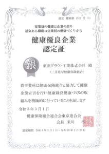 この度、当社は、健康保険組合連合会東京連合会に「健康企業宣言」を行い、健康保険組合連合会東京連合会より健康経営健康づくりの取り組みを積極的に行っている企業として、令和8年3月1日付で、「健康優良企業(銀の認定)」を取得いたしました。(健銀第1512号(5) )