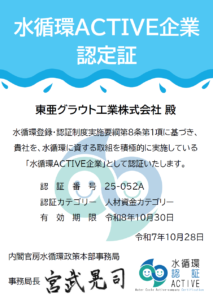 当社は、内閣官房 水循環政策本部事務局より、令和7年度「水循環企業登録・認証制度」水循環ACTIVE企業として継続して登録・認証されました。昨年度に続き2回目の認証となります。