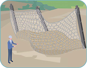 強いネットで山の斜面がくずれないようにし、落石などの自然災害から人々の命や家など大切なものを守ります。