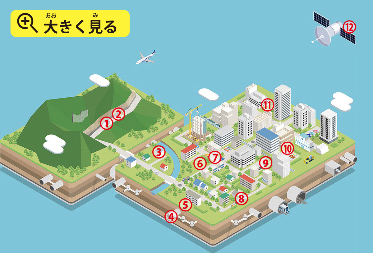 建物や地下の地面を強くする工事をしたり、地下にある大切なトンネルを直したりして、安心安全な社会を支えます。